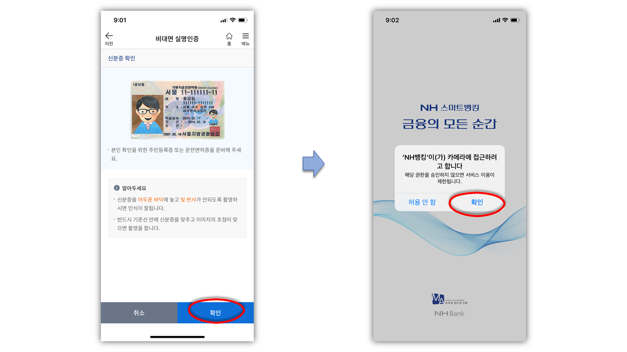 확인을 누르면 'NH뱅킹'이(가) 카메라에 접근하려고 합니다. 에서 확인을 누릅니다.