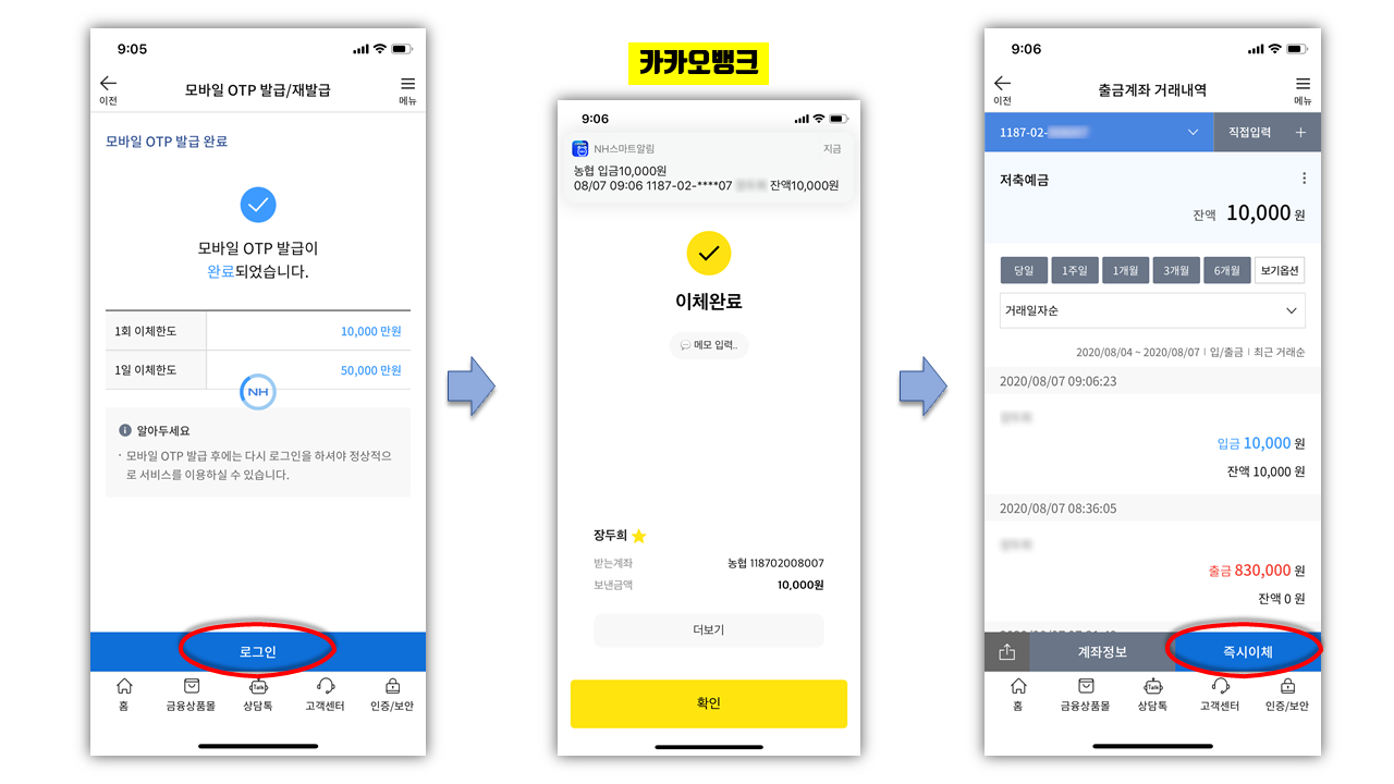 모바일OTP를 시험해보려고 하는거니까, 바로 "즉시이체"를 누릅니다.