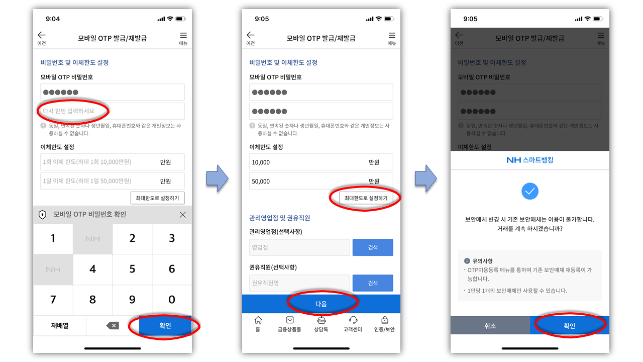 우측 아래에 있는 "인증/보안"을 누르고, OTP서비스, 모바일OTP발급/재밥급 을 차례로 누릅니다.