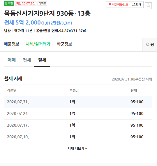 월세는 현재 매물은 없고, 시세만 보면 1억에 95-100 인것을 보실 수 있습니다.