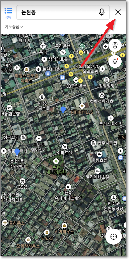논현동을 검색했기 때문에 논현동 전체가 핑크색으로 선택이 되어 있는 상태로 나오는데요. 이상태에서 아무곳이나 한번 터치하면 오른쪽처럼 지도가 잘 보이는데요. 여기서 오른쪽 위에 있는 엑스표를 터치합니다.
