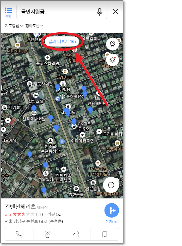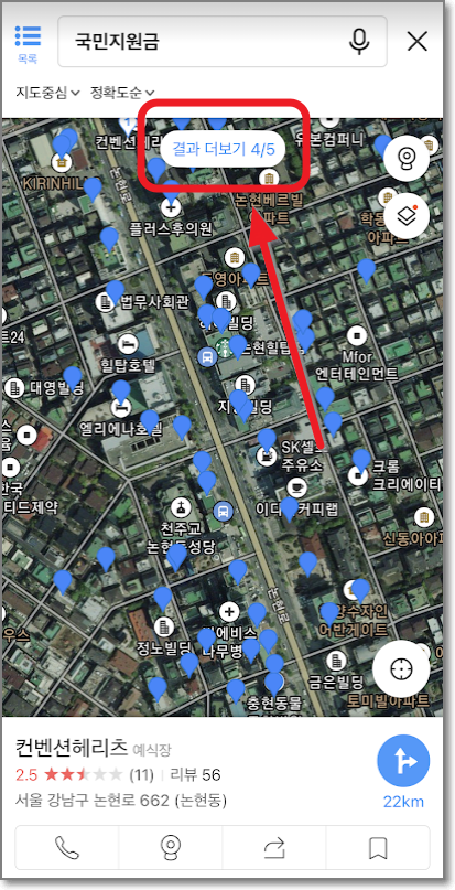 "이 지역 재검색"이라는 글자가 "결과 더보기 1/5"로 바뀌는 것을 볼 수 있으며 실제로 몇 번 누르면 국민 지원금을 받는 매장이 좀 더 많이 확인되는 것을 볼 수 있습니다.