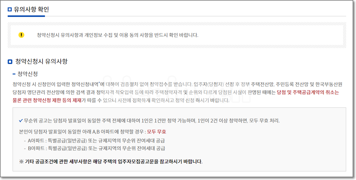 청약신청시 유의사항과 개인정보 수집 및 이용 동의 사항을 확인해야 합니다.