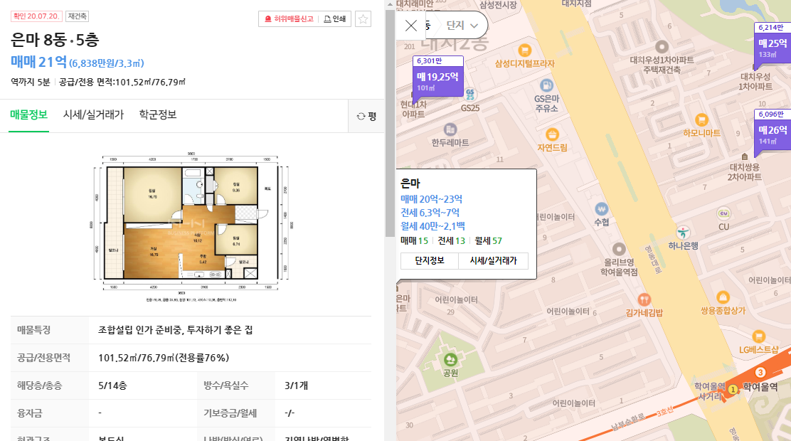 네이버 부동산의 가격을 보면 같은 면적(전용면적 76.79제곱미터)이 21억에 내놓은 상태입니다.