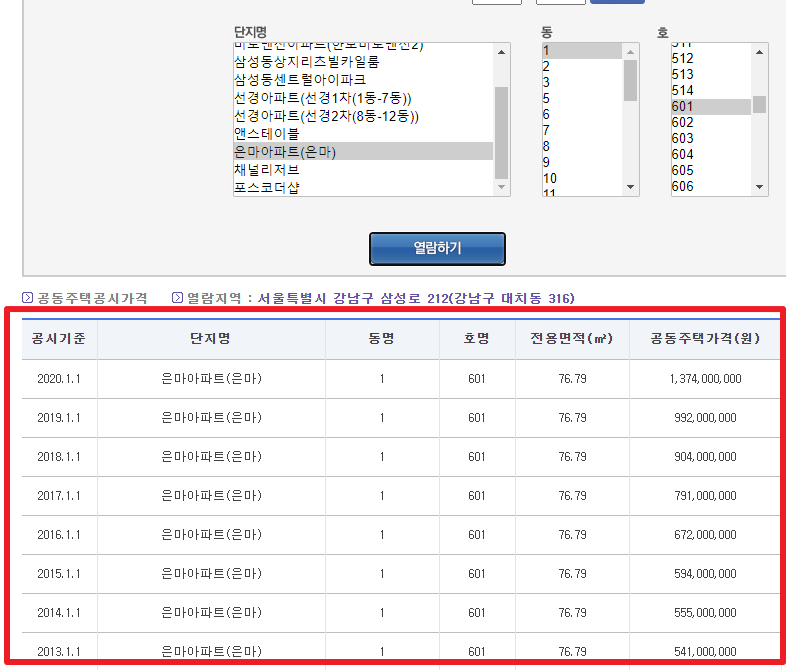그러면 2020년 8월10일 현재 기준으로 뉴스에도 많이 나오는 "은마아파트"의 공시가격과 네이버 부동산 가격을 비교해보겠습니다. 공시가격은 매년 1월1일에 공시되는 것이 원칙입니다.