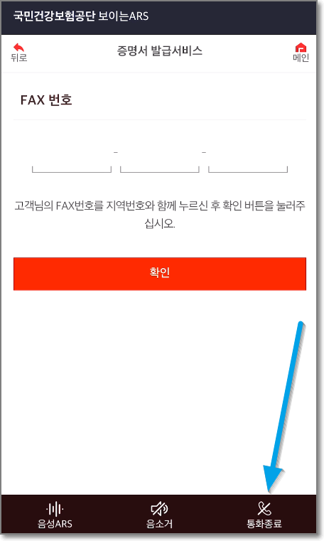 납부확인서를 받아볼 팩스번호를 입력하고 "확인"을 누르면 이제 좀 있으면 팩스로 납부확인서가 오게 됩니다. 이제 통화종료를 누르시면 됩니다.