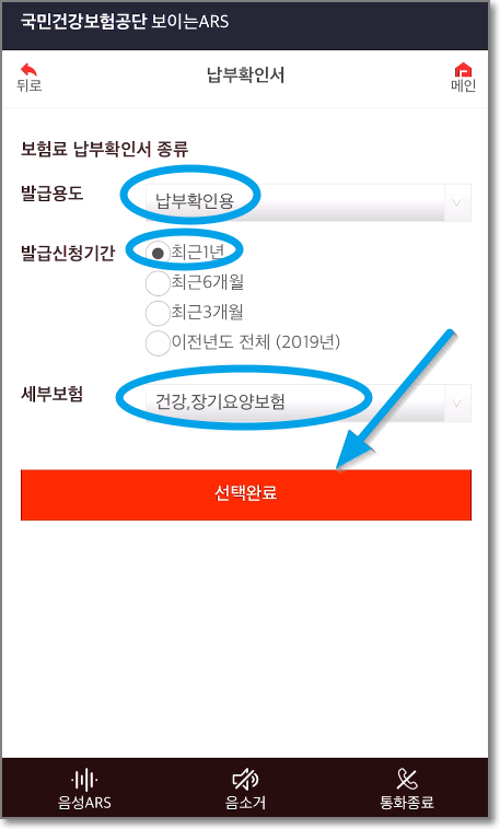 발급용도로 "납부확인용"을 선택하고 신청기간은 최근1년, 세부보험은 건강,장기요양보험을 선택하고 "선택완료"를 누른후 상태를 확인한 후 "선택완료"를 누릅니다.