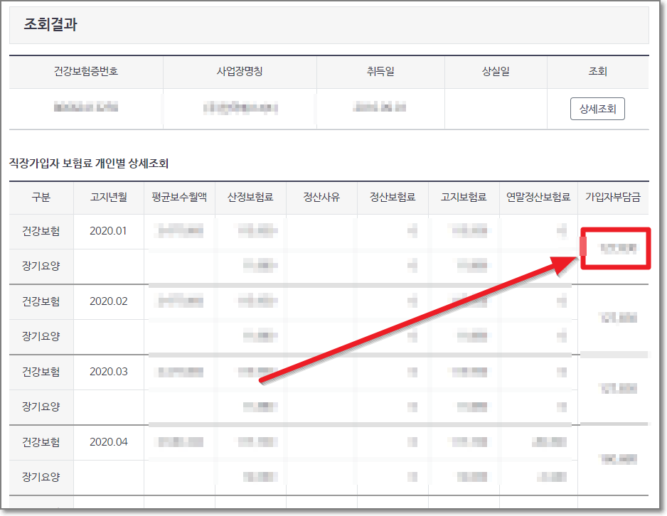그러면 조회결과가 나오는데요. 화살표친 가입자부담금이 본인의 건강보험료 입니다.