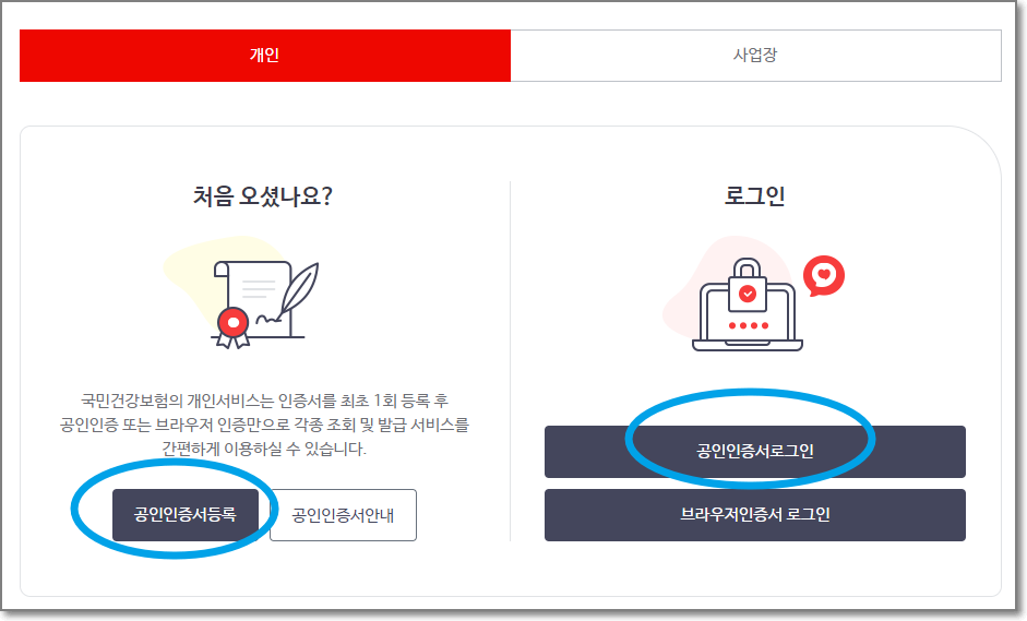 처음 접속이면 "공인인증서등록"절차를 거쳐야 하고, 이미 등록하셨다면 로그인을 하시면 됩니다.