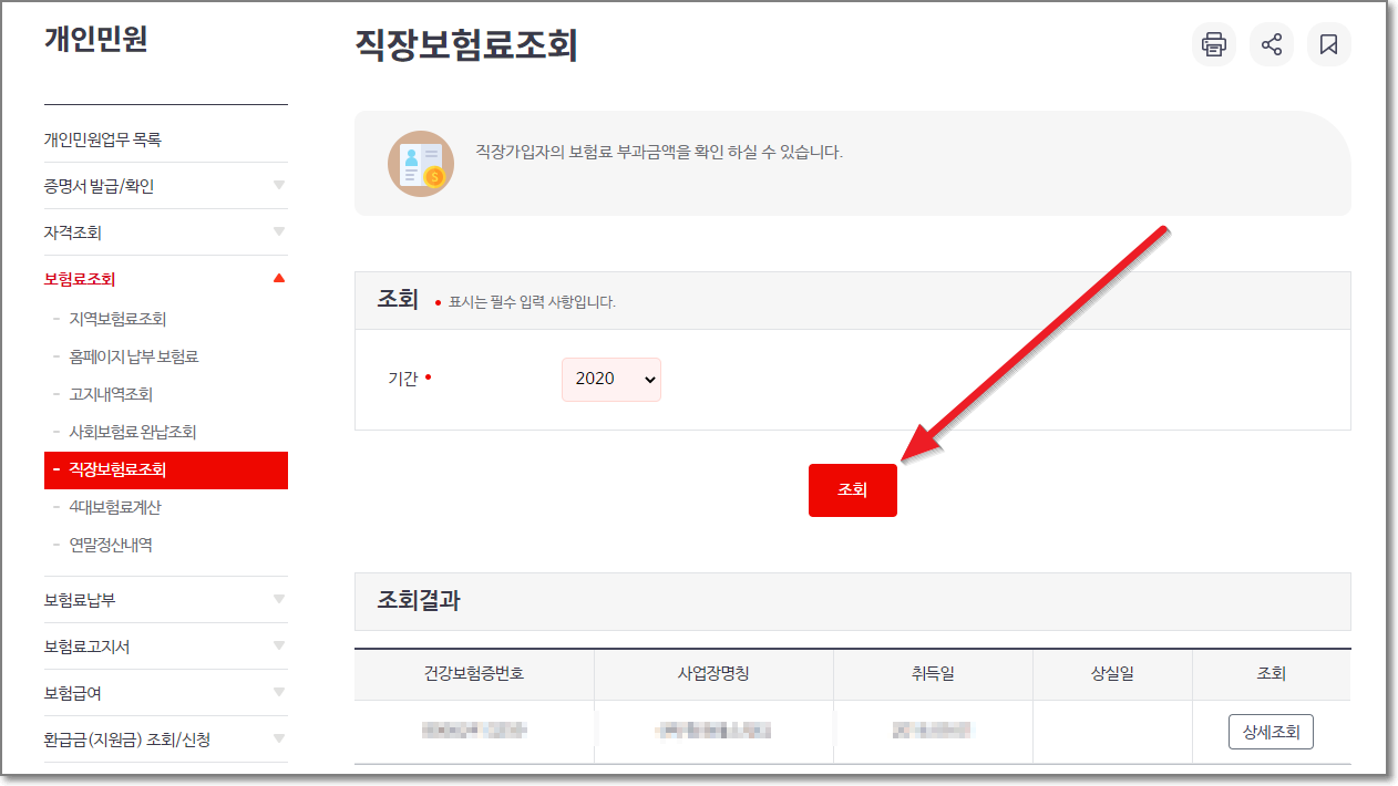 왼쪽 메뉴에서 "직장보험료조회"를 누르고 기간을 2020년으로 둔 후 조회를 누르면 됩니다.