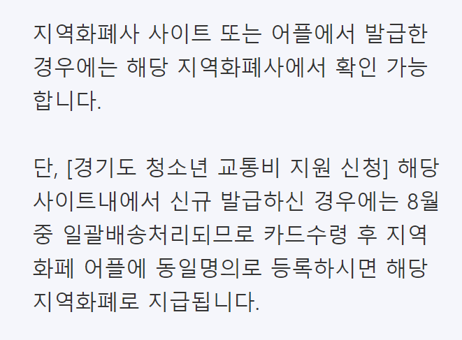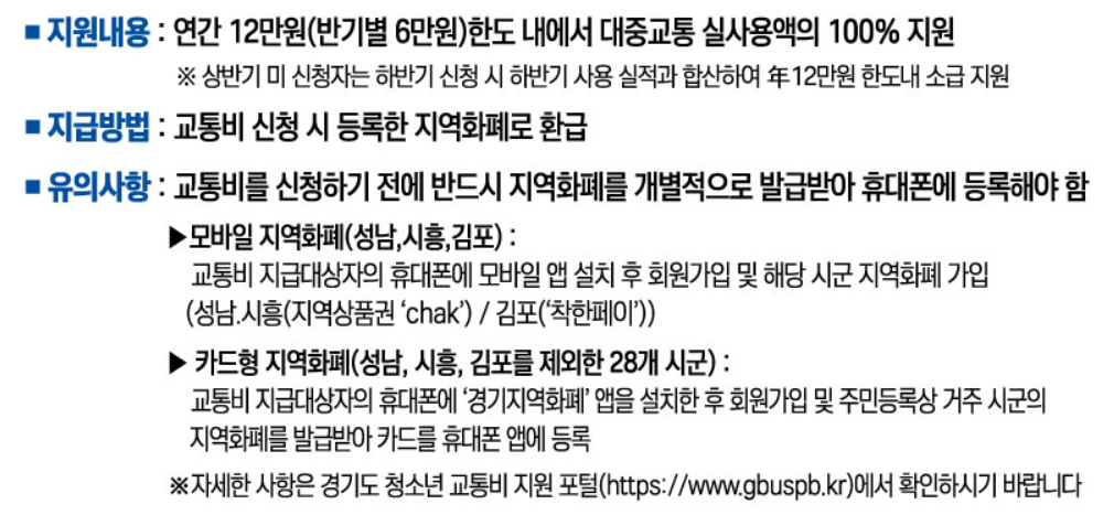 ● 지급방법 : 교통비 신청시 등록한 지역화폐로 지원(이미 쓴 교통비이므로 환급하는 형식입니다.)
