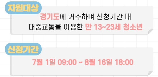 가장 먼저 신청기간은7월 1일 오전 9시부터 8월 16일 오후 6시까지 받고 있습니다. 지원가능한 대상은 경기도에 거주를 해야 하며 나이는 만 13세부터 23세 사이의 청소년이라고 합니다. 거주기간에 제한은 없지만 현재 주민등록이나 등본 기록 상에 경기도에 거주를 한다고 명시되어 있어야 해요. 그리고 해당하는 대중교통은 버스와 지하철입니다!