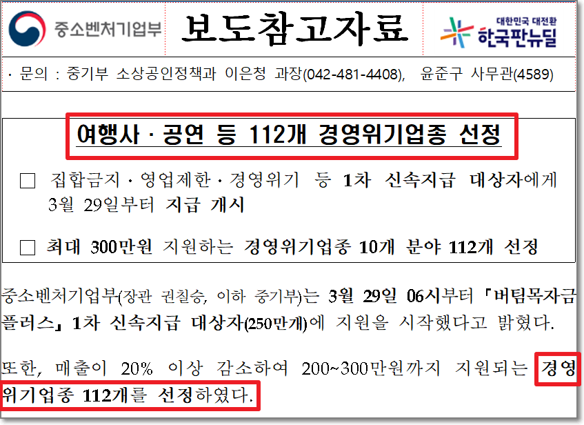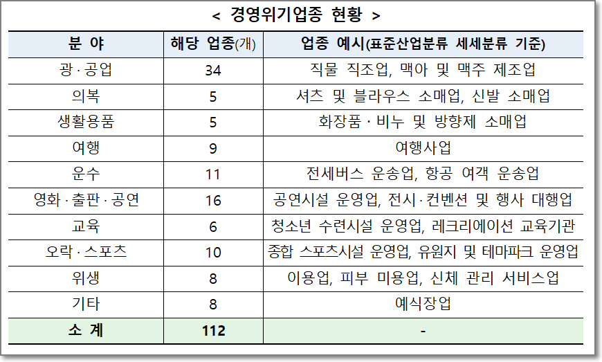 ※ 경영위기업종은 3월 29일(월)에 중소벤처기업부에서 보도참고자료로 발표되었으며 여행사. 공연 등 총 112개 업종을 경영위기 업종으로 선정하였습니다.
