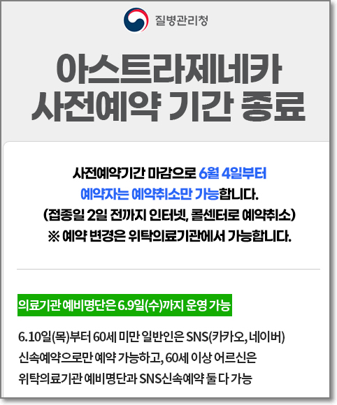 만 74세 이하의 고령자에 대한 AZ(아스트라제네카) 백신 예약이 6월 3일 자로 마감되었습니다.