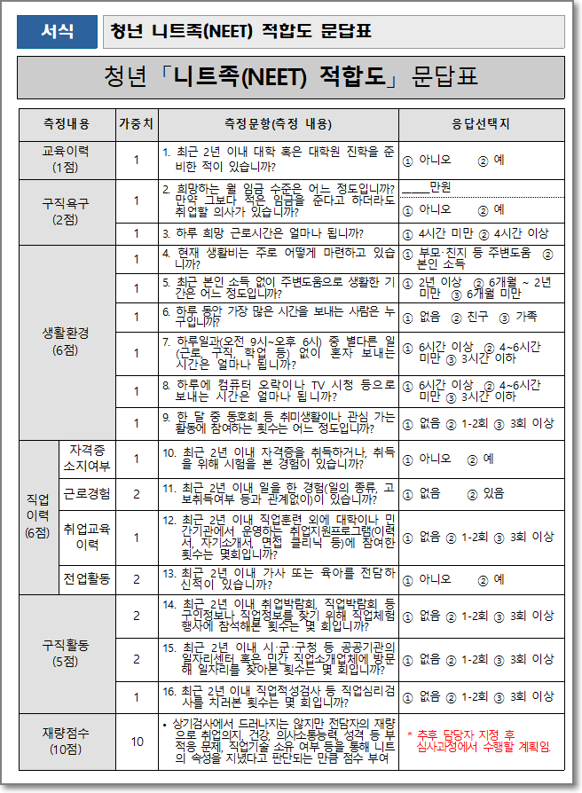 청년 니트족(NEET) 적합도 문답표