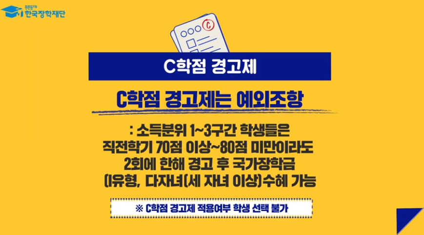 하지만! C학점 경고제란 소득분위 1~3구간에 속한 학생들의 경우 직전학기 성적이 국가장학금 기준 미만이라도 2회에 한해 경고 후 장학금 수혜가 가능한 제도입니다.