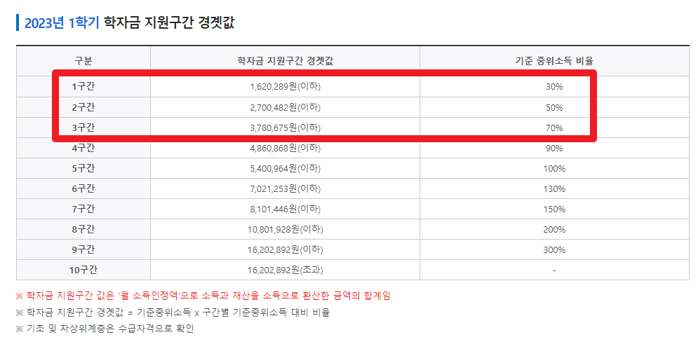 하지만 위의 기준에서 "기초생활수급자"와 "차상위계층"에 해당하는 가구의 대학생일 경우에는 기준이 10점 더 낮습니다.