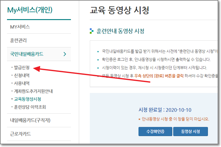 왼쪽에 있는 "국민내일배움카드" 발급신청 을 누릅니다.