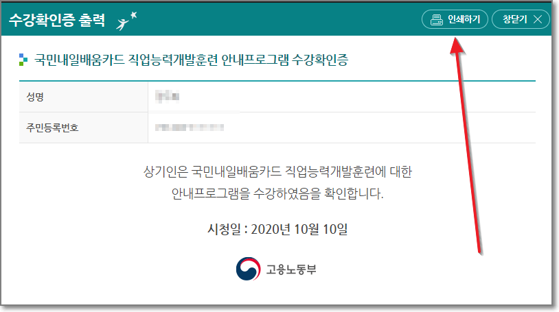 고용노동부에서 발급한 수강확인증이 나옵니다. 한번 "인쇄하기"를 눌러서 뭐가 나오는지 보겠습니다.