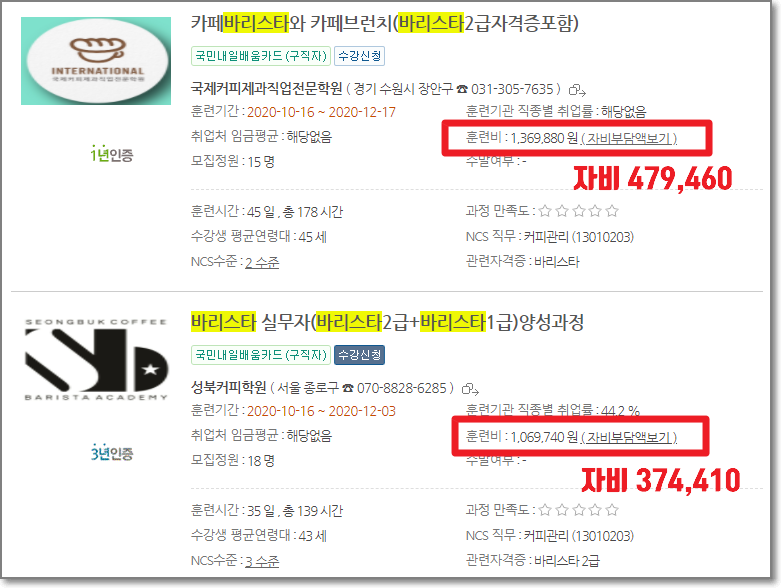 그리고 훈련비의 일부를 자부담 한다는 점 확인하셔야 합니다.(하지만 자부담은 최대가 수강료의 55%입니다.)