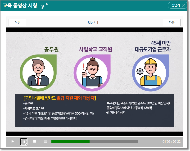 교육동영상은 국민내일배움카드 직업능력개발훈련을 정확하게 이해하고 훈련에 참여하도록 하기 위해 제작되었으니 성실히 시청하라고 합니다. 전체는 11단계입니다. "다음"을 누릅니다.