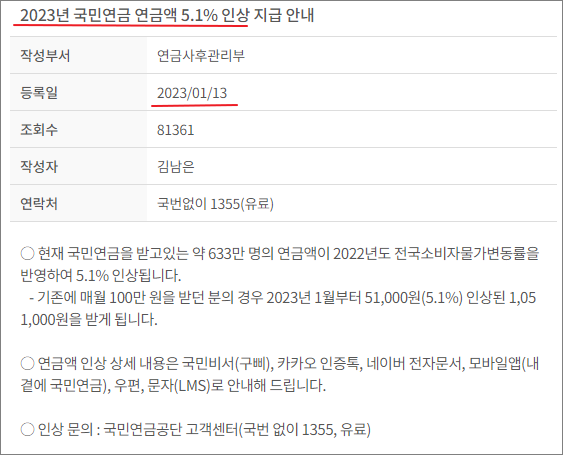 그리고 국민연금공단 홈페이지를 살펴보면 23년1월13일에 그 전년도(2022년)대비 5.1% 인상한다는 내용이 있습니다.