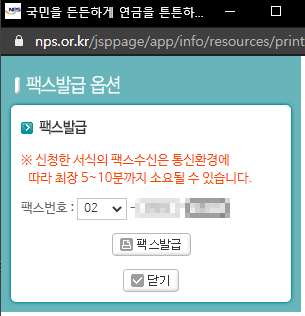 아래같은 창이 나오면 받으실 팩스번호를 입력하고 "팩스발급"을 클릭합니다.