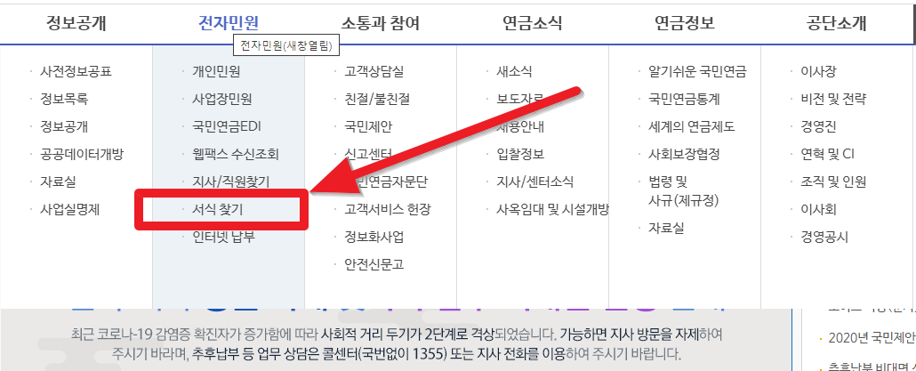 아래링크를 걸어놓은 국민연금공단 홈페이지로 가셔서 아래처럼 "전자민원"으로 마우스를 가지고 갑니다.