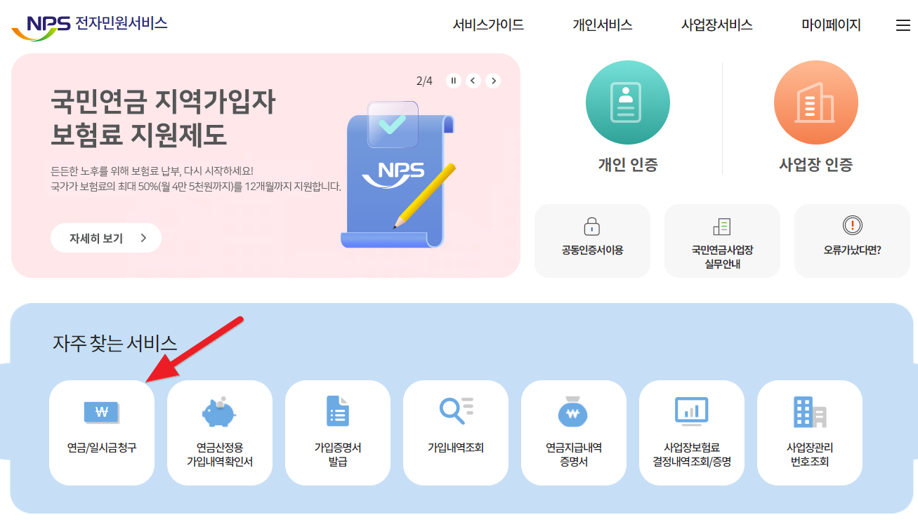 인터넷 신청의 경우 국민연금공단 홈페이지에서 신청할 수 있는데요. 주의할 점은 '국민연금 신청'이런식으로 되어있지 않고 '연금/일시금 청구'라고 되어있습니다.