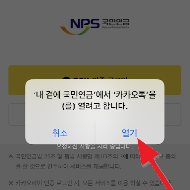 그러면 아래처럼 '내 곁에 국민연금'에서 '카카오톡'을 열려고 합니다. 라고 나오는데요. "열기"를 누릅니다.