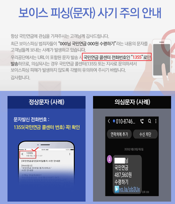 그전에 미리 알아두어야 할 사실이 있는데요.바로 보이스피싱입니다. 만약 아래처럼 ㅇㅇㅇ님 국민연금 수령하기 라는 링크가 스마트폰으로 온다면 절대로 누르면 안됩니다. 국민연금은 반드시 1355를 발신번호로 해서 문자를 보내니 1355번 이외의 발신자로부터 온 국민연금 수령하기 링크는 누르시면 보이스피싱에 당하게 됩니다.
