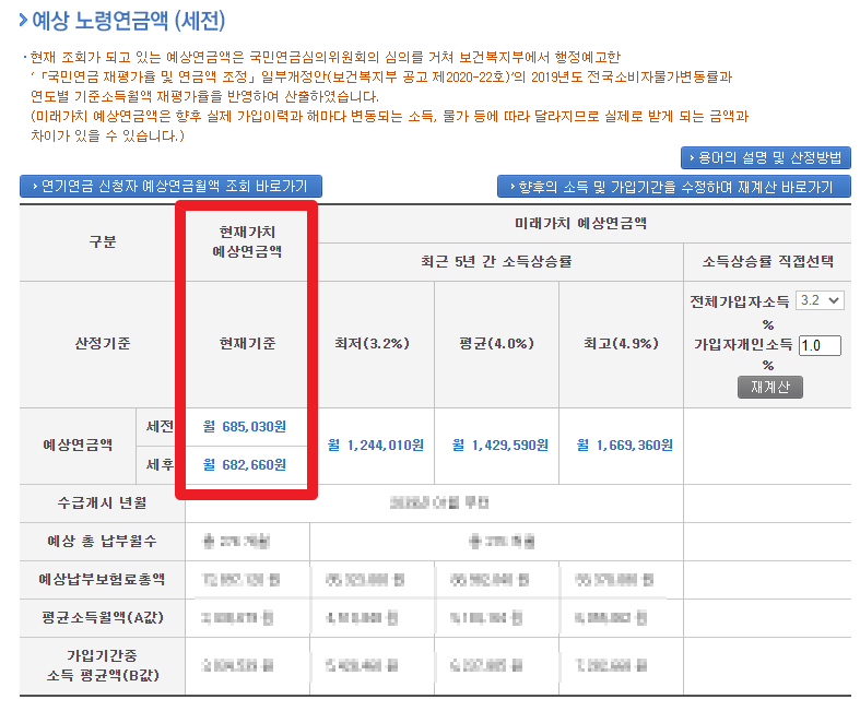 조회가 끝나면 바로 "예상 노령연금"이 나오게 됩니다. 저는 세후 682,660원을 받게 되는군요.