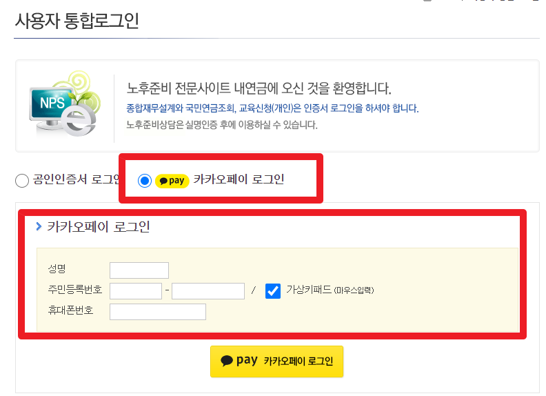 확인을 누르시면 아래처럼 "사용자 통합로그인"이 나오게 되는데요. 여기서 "공인인증서 로그인"을 해도 되고 "카카오페이 로그인"을 해도 됩니다. 오늘은 카카오페이 로그인으로 해보겠습니다.