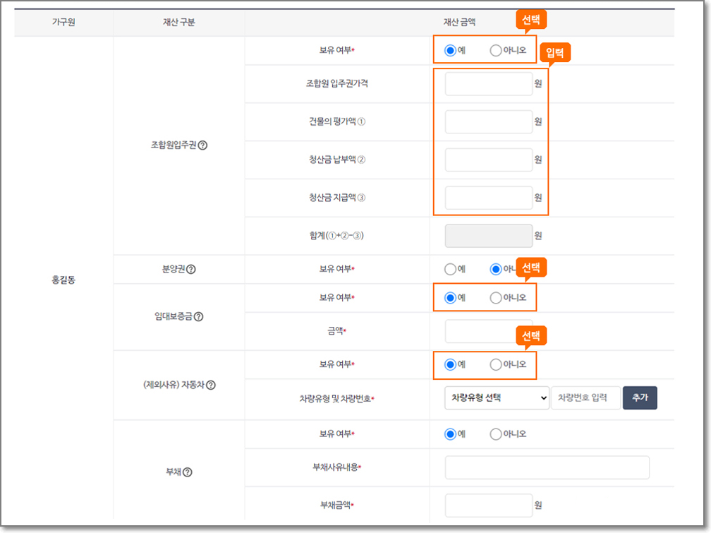 가구원별 재산을 모두 등록합니다.