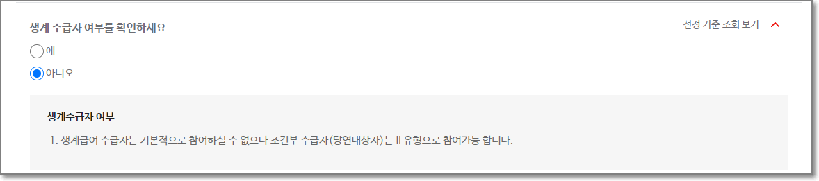 다음으로 생계수급자인지 여부를 선택합니다.