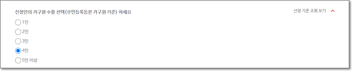 다음으로 신청인의 가구원 수를 선택합니다.(주민등록등본에 있는 가구원 기준)