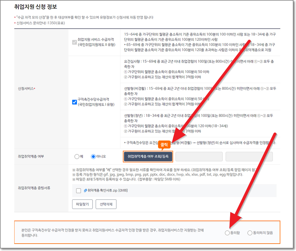 그리고 아래처럼 "취업취약계층 여부 조회 및 등록"을 누르고 확인한 후에 아래에 있는 동의함을 누릅니다.