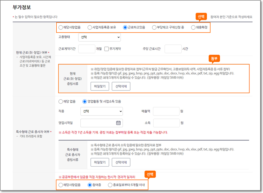 부가정보는 1,2유형 신청자 모두 반드시 작성을 해야 합니다.