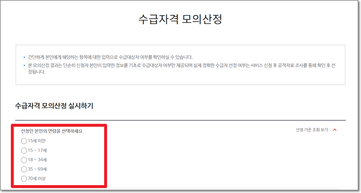 다음의 "수급자격 모의신청" 화면에서 나이를 선택합니다.