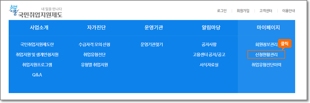 위에서 접속한 국민취업지원제도 홈페이지에서 회원가입을 하고 로그인을 한 후에 아래처럼 신청현황관리를 누릅니다.
