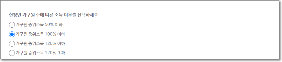 신청인 가구원 수에 따른 소득(중위소득)여부를 선택합니다.