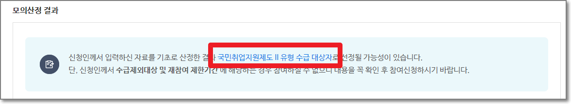 단, 이는 신청인께서 입력하신 자료를 기초로 모의 산정된 것이며 실제 신청 후 결과는 다를 수 있습니다. 자세한 내용은 주소지 관할고용복지+센터에 유선/방문하시어 상담하시기 바랍니다.