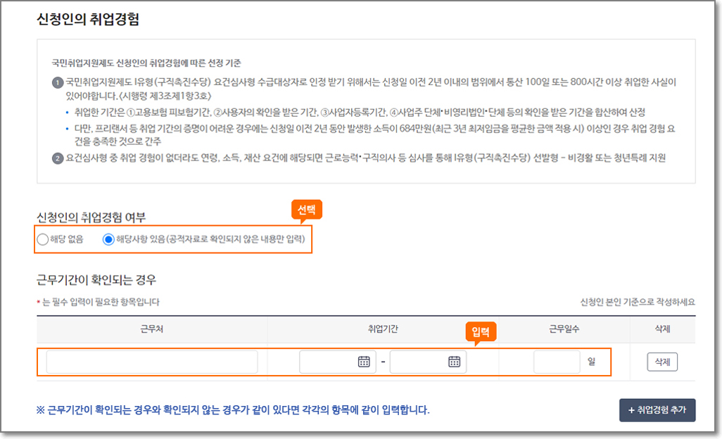 신청인의 취업경험은 수급대상자로 인정 받기 위해서는 신청일 이전 2년 이내에 통산 100일 또는 800시간 취업한 사실이 반드시 있어야 합니다. 아래를 모두 등록합니다.
