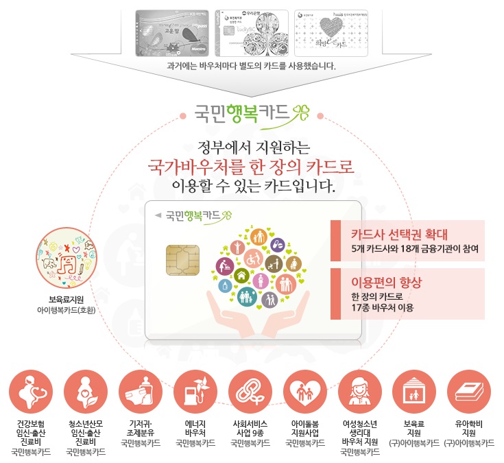 정부에서 지원하는 국가 바우처를 한 장의 카드로 이용하는 국민행복카드
