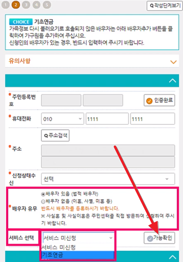 배우자 유무상태를 체크하시고 서비스선택에는 "기초연금"을 선택하시고 "가능확인"을 누릅니다.