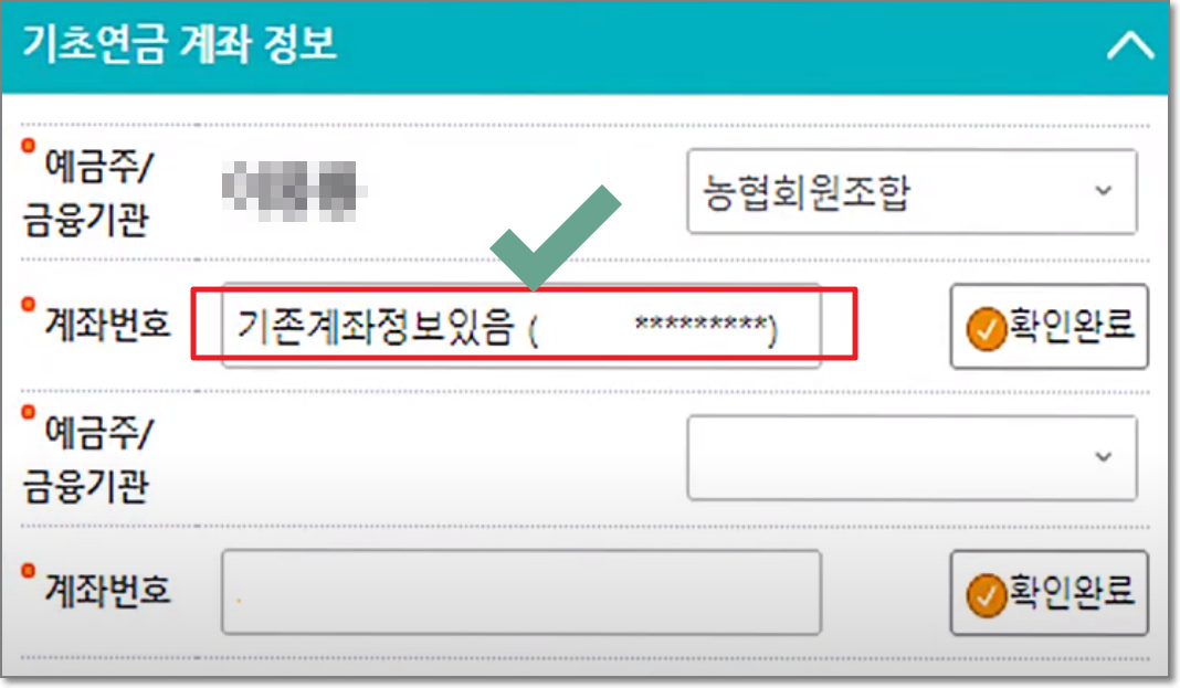 만약에 기존에 복지서비스를 받고 계신다면 계좌정보에 기존계좌정보가 나타나게 됩니다. 이 경우에는 다른 계좌를 입력할 수 없으니 이점 유의하시기바랍니다.