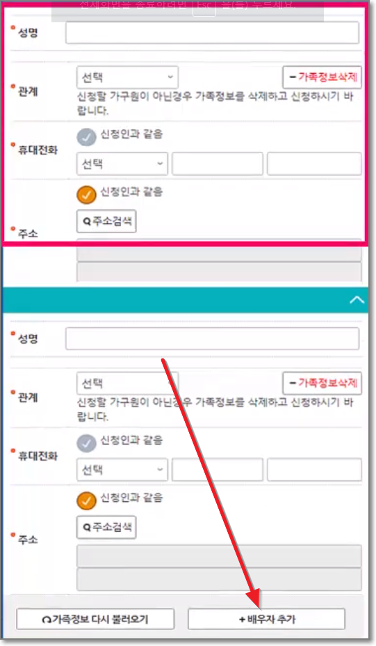 배우자가 신청자와 동일한 주소지에 등록되어 있지 않을경우 아래화면처럼 아무것도 안뜨게 되는데요. 이때는 직접 내용을 입력하고 배우자 추가 버튼을 눌러서 등록을 합니다.