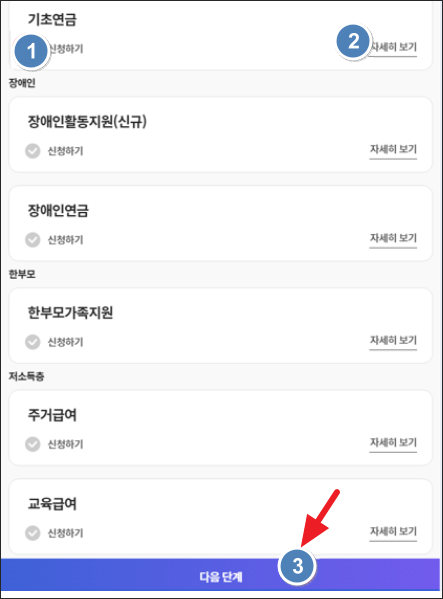 다음화면에서 아래로 화면을 내려서 '기초연금' 앞 체크박스를 클릭하고 '자세히보기' 버튼을 눌러서 기초연금에 대한 상세 안내화면을 확인하고 아래쪽의 '다음단계'를 눌러서 개인정보 활용동의 화면으로 이동합니다.