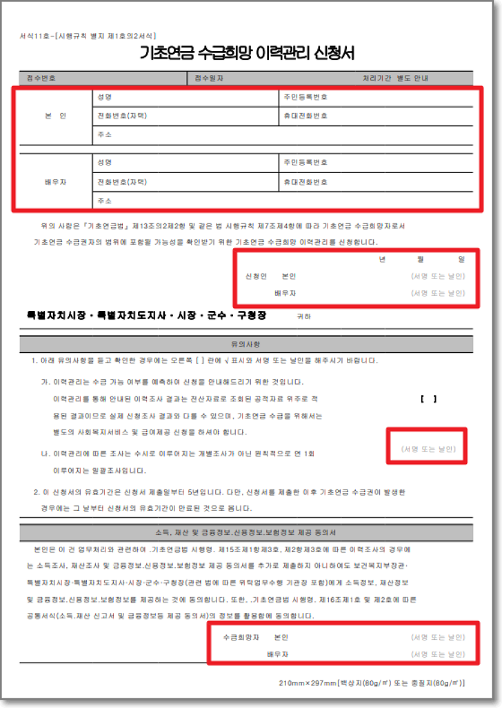 기초연금 수급희망 이력관리 신청서 작성은 아래 화면을 참고해서 작성하시면 됩니다.