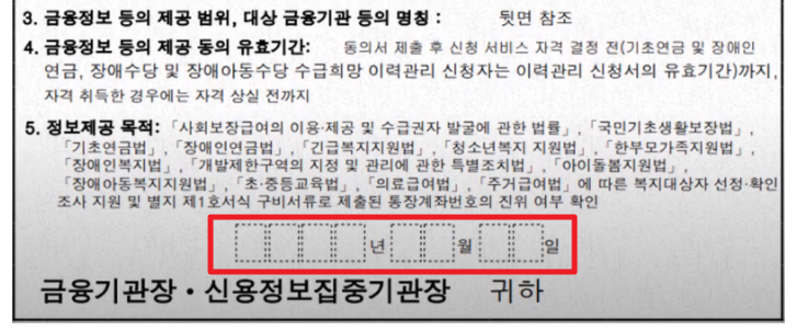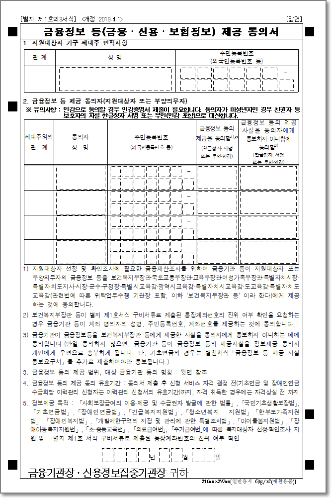 2번항목인 금융정보등 제공 동의자(지원대상자 또는 부양의무자)에는 아래처럼 세대주와의 관계를 기재하고 배우자 성명을 쓰고 배우자 주민번호와 오른쪽 빈칸에 "한글정자"로 이름을 써 넣습니다. (반드시 배우자 본인서명이 필요)